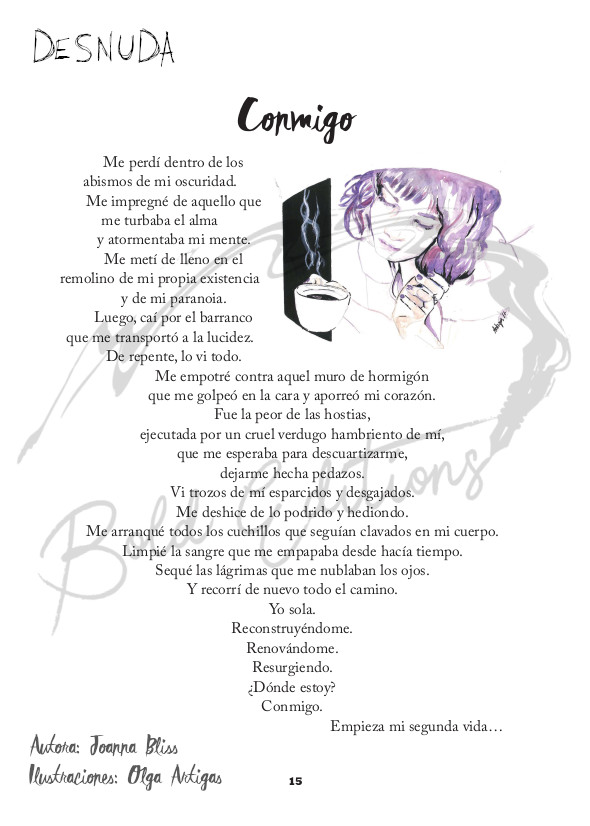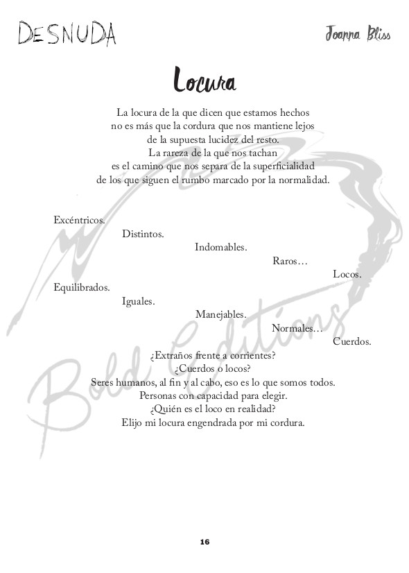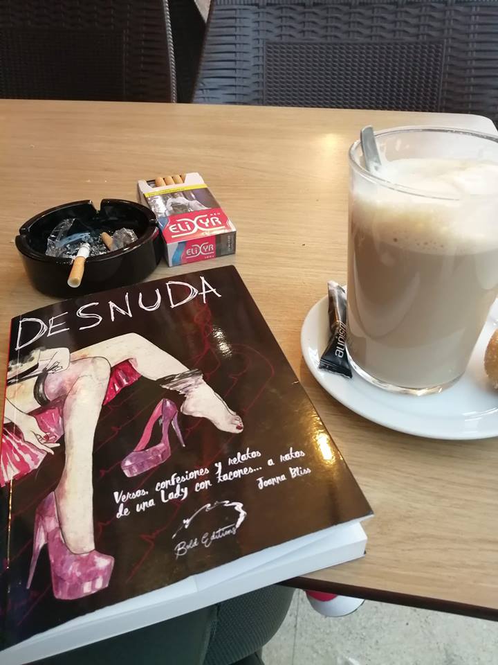 En líneas generales, la poesía, el relato y el cuento, tienen para muchos lectores un atractivo especial. Su contenido va metido en pequeñas dosis que pueden constar de una, dos, tres o pocas más páginas, y si además vienen recopilados en formato libro, sabemos que podremos encontrar uno detrás de otro en una maravillosa sucesión de historias breves. Resulta curioso que este sea un país en el que este género — especialmente el del relato—, no sea demasiado valorado por los editores de casa y sean muy pocos los autores nuestros conocidos por este tipo de obras, cuando precisamente han sido esos editores los que nos han hecho llegar esos mismos relatos de autores latinoamericanos o norteamericanos como pueden ser: Julio Cortázar, Jorge Luís Borges, Gabriel García Márquez, Raymond Carver, Charles Bukowski o Ernest Hemingway, por citar a pocos entre los muchos grandes que se iniciaron en la literatura escribiendo historias en las páginas de los periódicos, y que no dejaron de practicar la historia corta a lo largo de sus prolíficas carreras. Afortunadamente, Joanna no ha sido una autora que se haya amedrentado ante esa desgana por parte del mercado editorial, y en su día, decidió expresarse, y se expresa, en este formato que muchos pensamos que puede llegar a constituir parte importante de la narrativa en un futuro más bien cercano. En cualquier caso... sea Joanna o no, «una lady con tacones... a ratos», lo que está claro es que en su obra, se nos muestra inequívocamente... Desnuda.